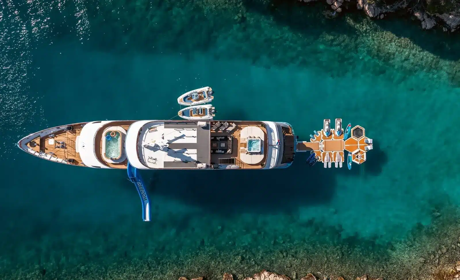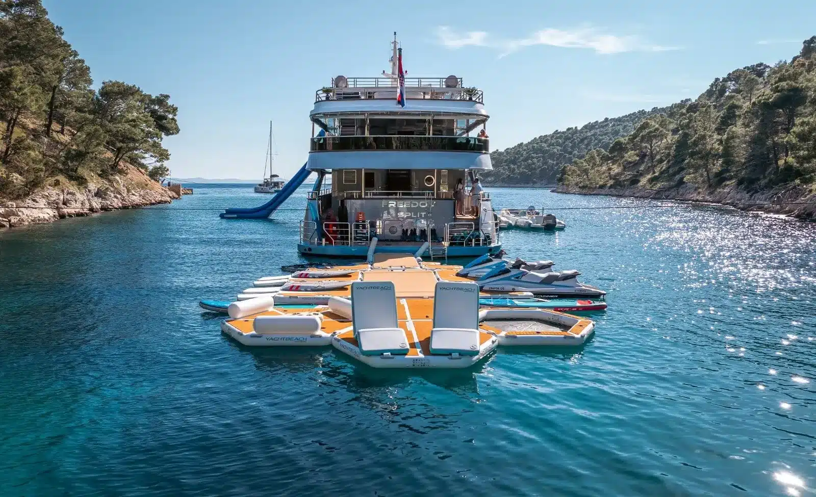 Freedom is built for guests who want the yacht itself to carry the week. Instead of relying only on the route, it gives you enough space, activity, and onboard variation that a day at anchor still feels full.